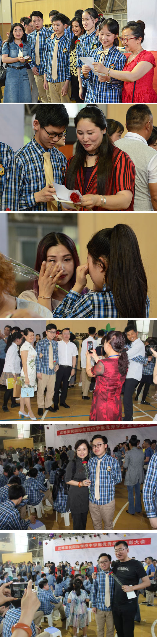 受表彰的同學們,紛紛將父母請到臺前,將代表感恩的鮮花、感謝信和擁抱送給親愛的爸爸媽媽。為了孩子的成長,您辛苦操勞了!
