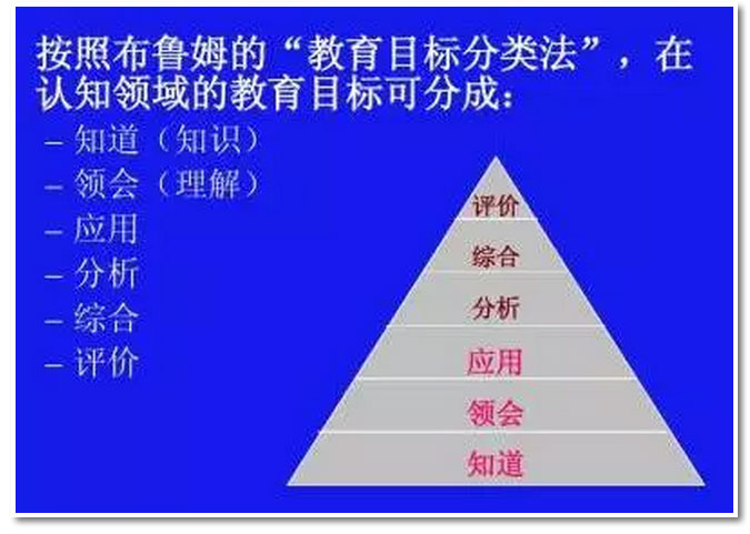 布魯姆思維層次分六個(gè)方面,從低到高依次是記憶——理解——應(yīng)用——分析——評(píng)價(jià)——創(chuàng)造。知識(shí)和技能的學(xué)習(xí)通常只能發(fā)展三個(gè)層次,從“記憶”到“應(yīng)用”,而有概念的參與,可以從“理解”到“創(chuàng)造”五個(gè)層次上發(fā)展思維。