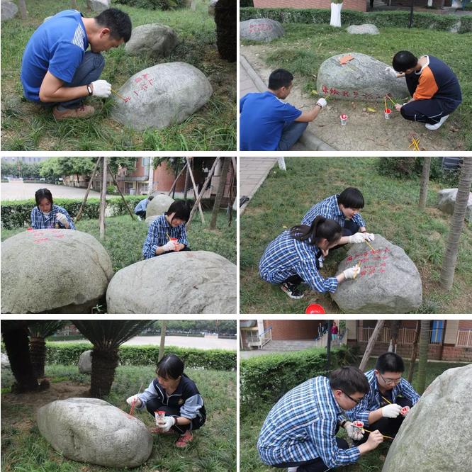 隨著時間的推移,石刻上的字跡已經變得模模糊糊,無法第一時間辨認出它的真面貌。美術老師熊江發現了這一問題,主動向學校請纓,帶領著八位藝術特長生,用自己手中的畫筆,將心語林重新書畫,用藝術將它再次點亮,用藝術點亮我們的心靈。